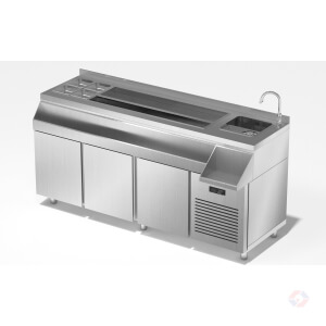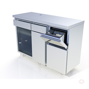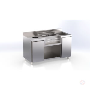 Posto cafe έχει ένα ψυγείο με ένα μηχάνημα μήκους 120 εκατοστών με 2 πόρτες, στο πάνω μέρος 3 ουδέτερα συρτάρια δεξιά θήκη σκουπιδιών με μια τρύπα με λάστιχο για να χτυπήσει την ομάδα από την πλευρά leſt υπάρχει μια μονωμένη θήκη πάγου και leſt γούρνα με ξέπλυμα.